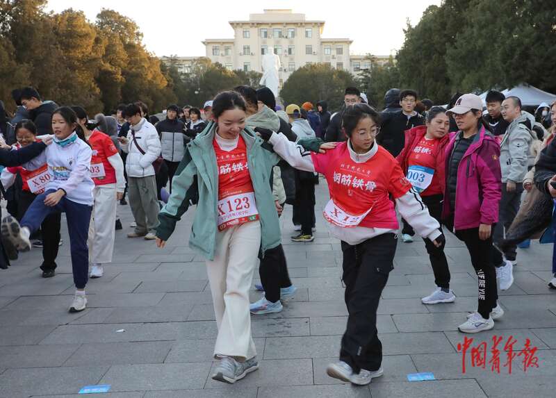 12月7日,北京科技大学,校园半程马拉松接力赛开始前,参加比赛的大学生在做准备活动。中青报·中青网记者 陈剑/摄