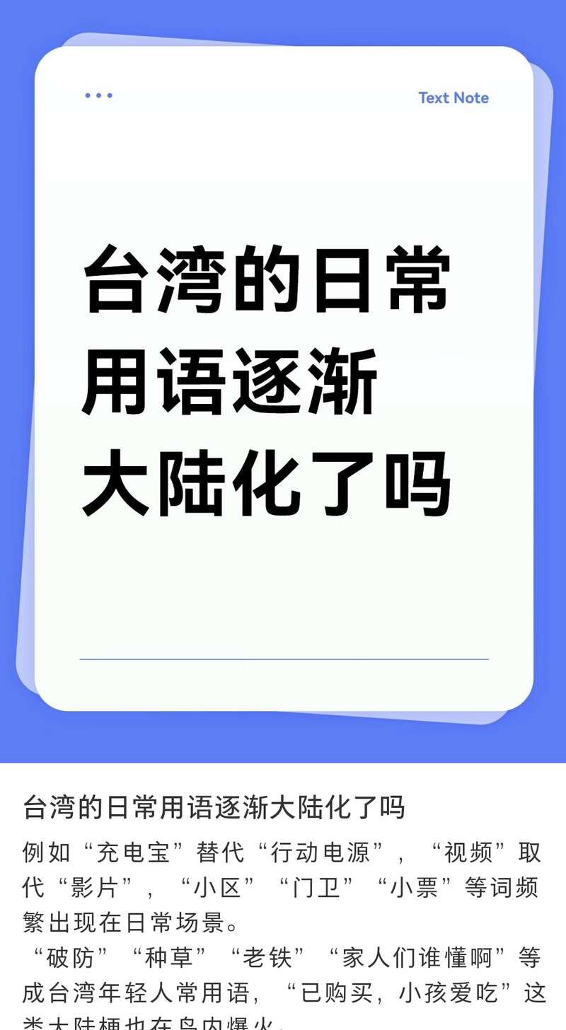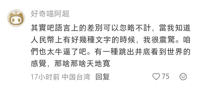 总体来讲,多数参与讨论者觉得,大陆流行用语越来越多地出现在台湾民众的日常对话中是大势所趋。有台湾网友在评论区留言:“瞎说什么大实话,啥都说,可咸可甜。”还有人感叹道:“其实语言上的差别可以忽略不计……当我知道人民币上有好几种文字的时候,我很震惊……有一种跳出井底看到世界的感觉,那啥那啥天地宽”……