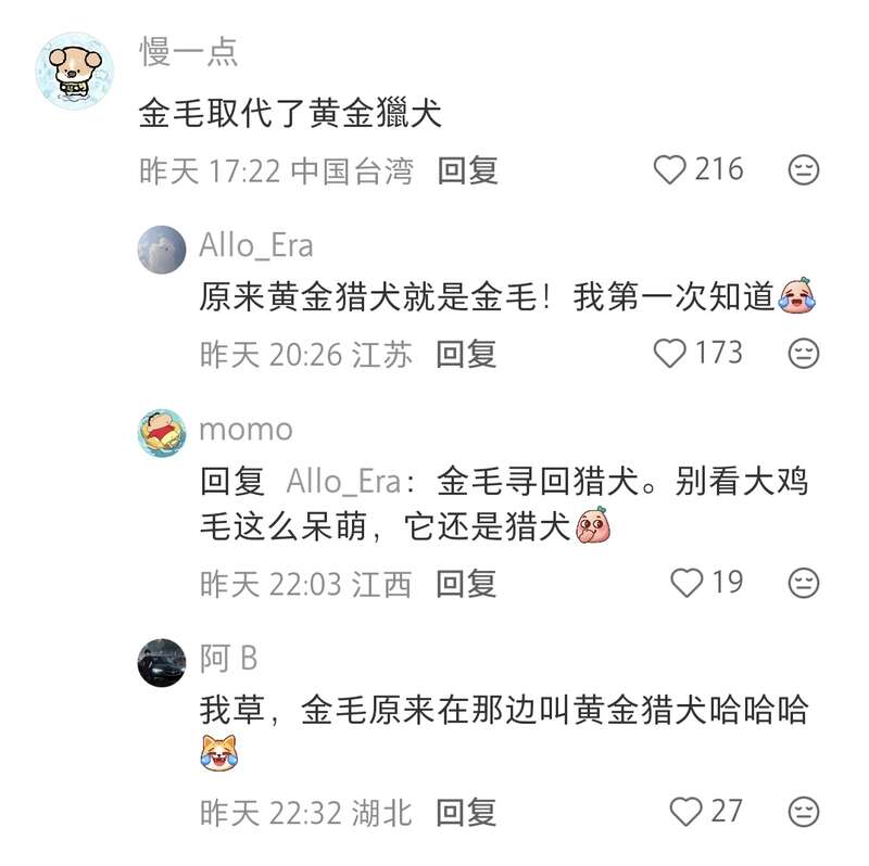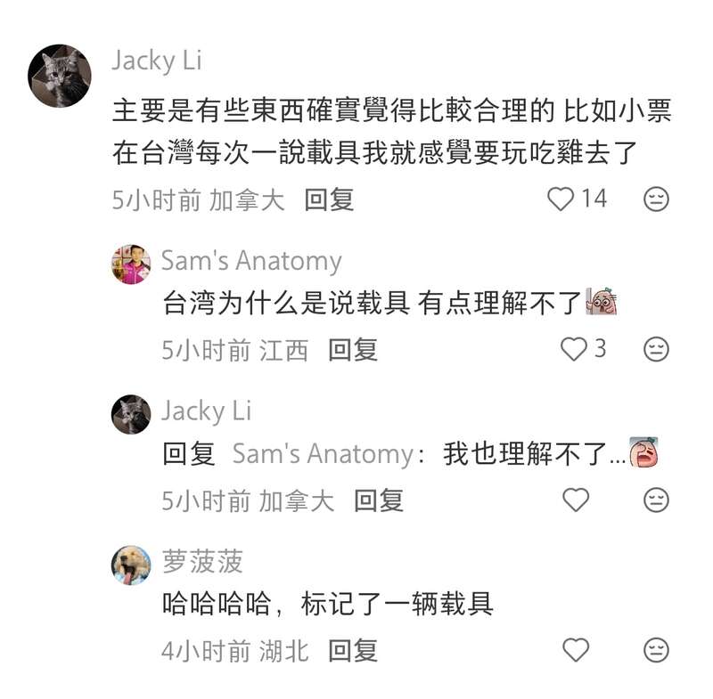 相关讨论串中,不时有IP地址标注为“中国台湾”或使用繁体中文的网友现身说法。针对两岸就同一事物的表述差异,有台湾网友分享自己近年来注意到的种种变化:“‘金毛’取代了‘黄金猎犬’。”“‘我的对象’取代了‘我的男朋友’或‘我的女朋友’。”有人认为,大陆采用的表述听起来更合理,而台湾原本的表述不太容易理解。他们举出的例子之一是,“购物小票”在台湾被称作“载具”,“每次一说载具我就感觉要玩吃鸡去了”。