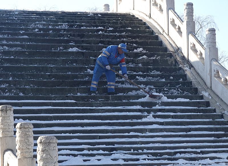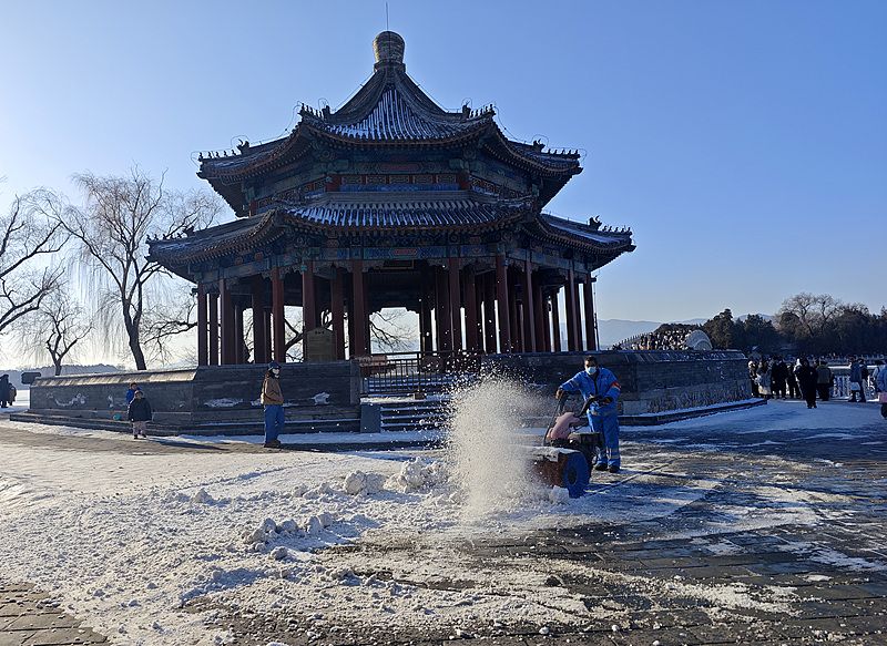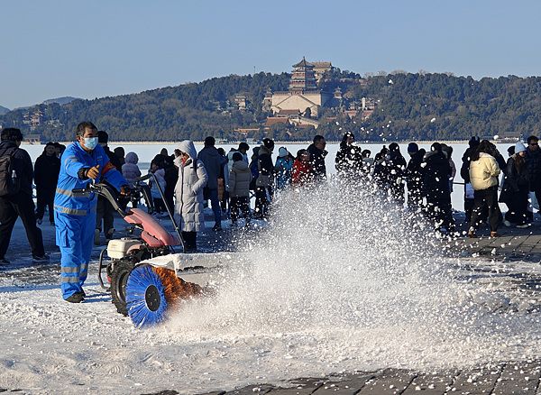 颐和园保洁人员扫雪铲冰 确保游人游览安全