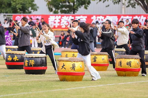 2025年12月14日,位于福建省晋江市的泉州轻工职业学院第九届运动习惯比试大会的彩排现场,大学生正在进行二十四节令鼓展示。