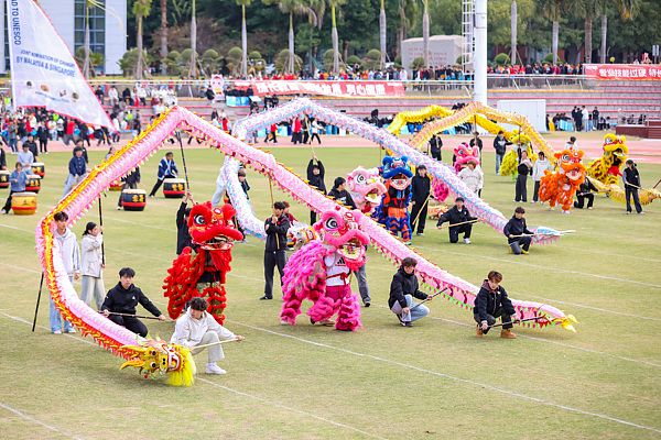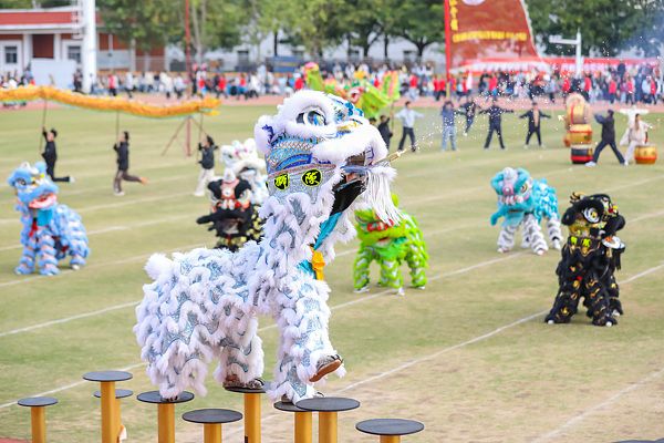 2025年12月14日,位于福建省晋江市的泉州轻工职业学院第九届运动习惯比试大会的彩排现场,大学生正在进行非遗舞狮展示。
