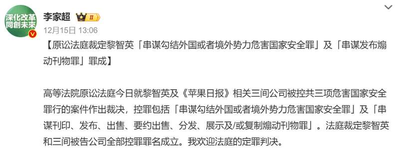 中国青年报客户端北京12月16日电(中青报·中青网记者 王梓)香港特区高等法院12月15日裁决,反中乱港分子黎智英两项串谋勾结外国势力罪及一项串谋发布煽动刊物罪成立。