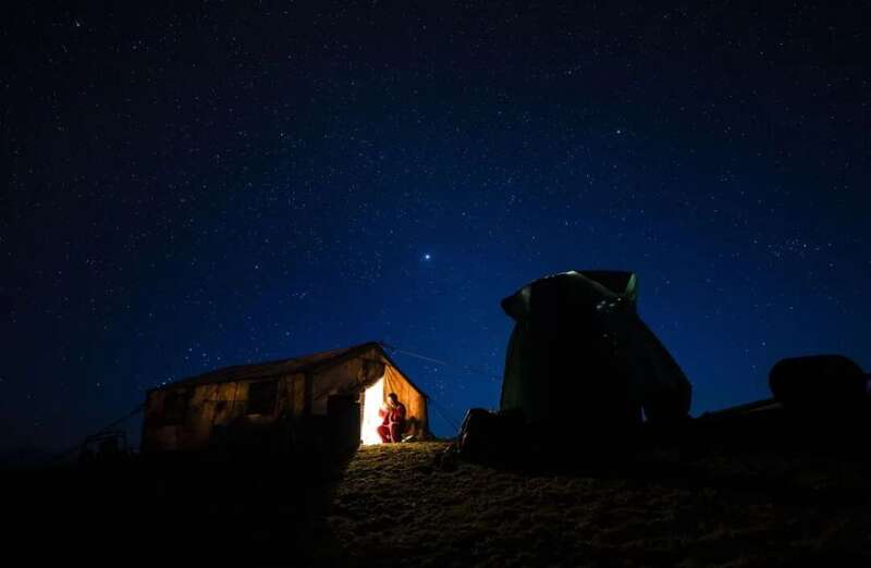 这是今年五一前夕,我和新疆日报记者蔡老师到物探队采访拍下的一张照片。在海拔3000多米的昆仑山巅,夜幕降临,辛苦了一天的钻井机组钻工们回到山顶临时宿营地,孤零零的小帐篷透出温暖的灯光,一名钻工坐在帐篷口吃晚饭,头顶是西昆仑的漫天星河,他们是找油找气的石油人,他们的工作既浪漫又艰辛。@王健