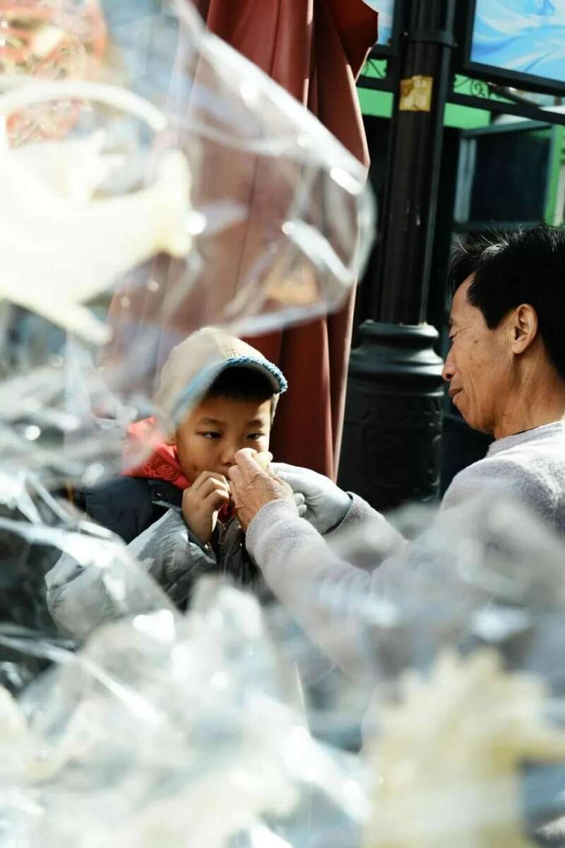 在天津,吹糖人的匠人在指导小孩儿。那一刻,阳光正好,我看到匠人满眼温柔地望着小孩儿,冬日的温馨在此具象化。@x