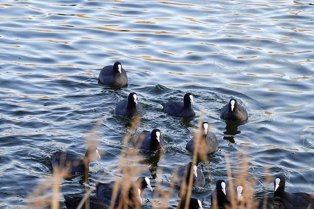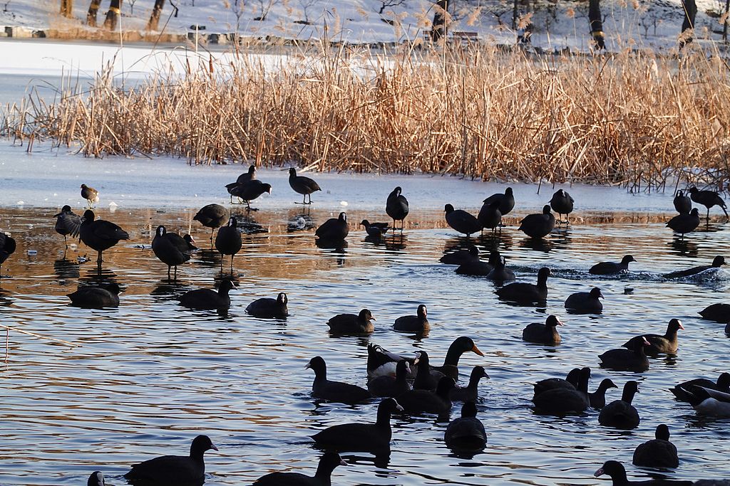2025年12月14日,北京圆明园,雪后黑天鹅与骨顶鸡群。