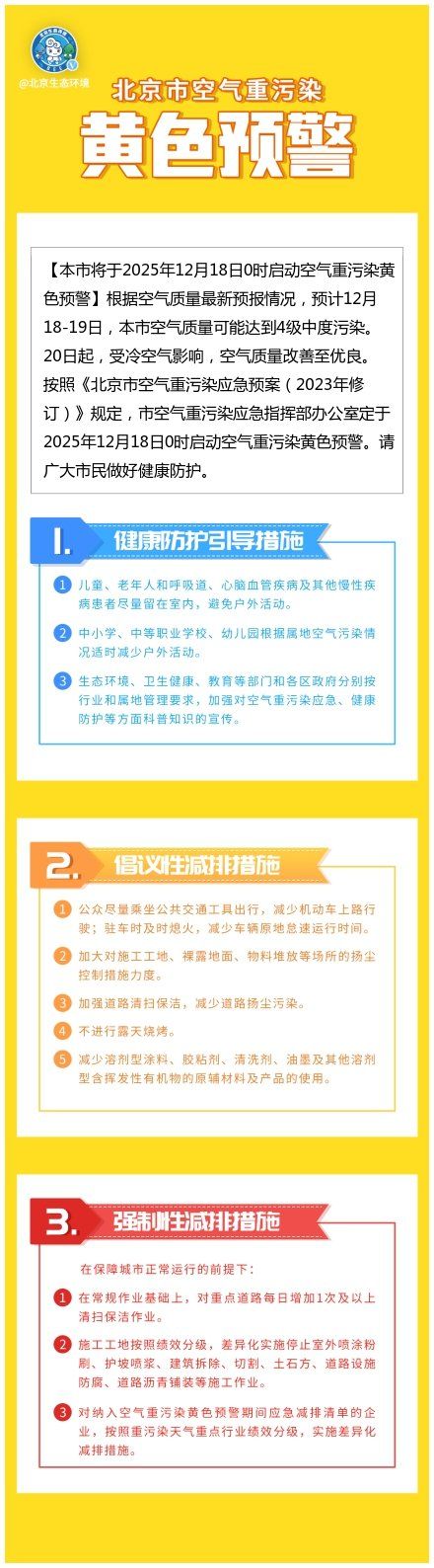 按照《北京市空气重污染应急预案(2023年修订)》规定,市空气重污染应急指挥部办公室定于2025年12月18日0时启动空气重污染黄色预警。请广大市民做好健康防护。