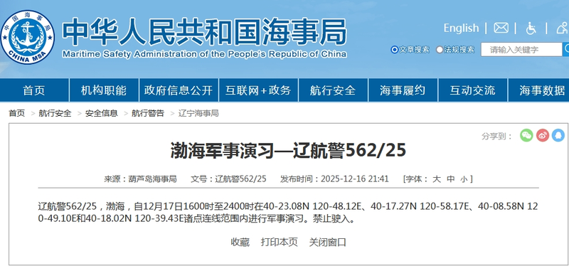 据中国海事局网站消息,葫芦岛海事局发布航行警告,12月17日16时至24时,渤海部分海域进行军事演习,禁止驶入。