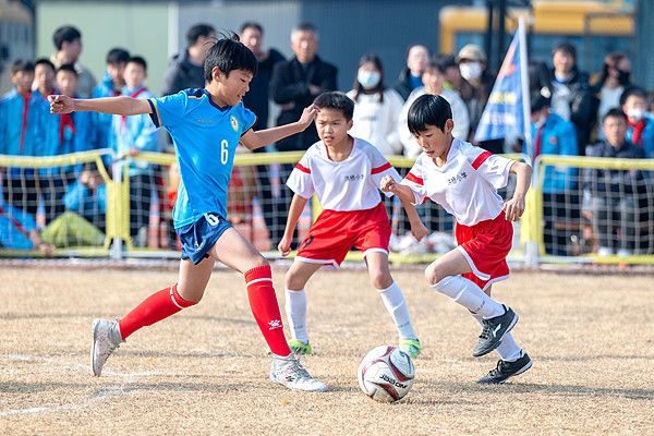 2025年12月18日,浙江湖州,长兴县夹浦镇中心小学运动场,夹浦镇中心小学和太湖图影小学的学生参与校园足球邀请赛。
