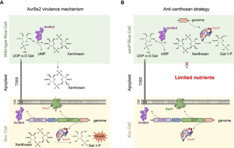 据介绍,王善之团队的重要发现在于揭示了致病菌Xoc在水稻体内建立的一条“合成—转运—利用”营养通道,通过持续掠夺宿主养分来维持自身生长的机制。研究人员发现,如果在水稻体内“表达分解酶XanP”,就能降解AvrBs2合成的黄单胞糖,从而切断病菌的这条营养获取途径,增强水稻对该病的抗性。