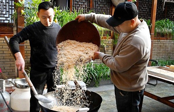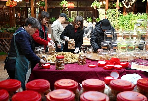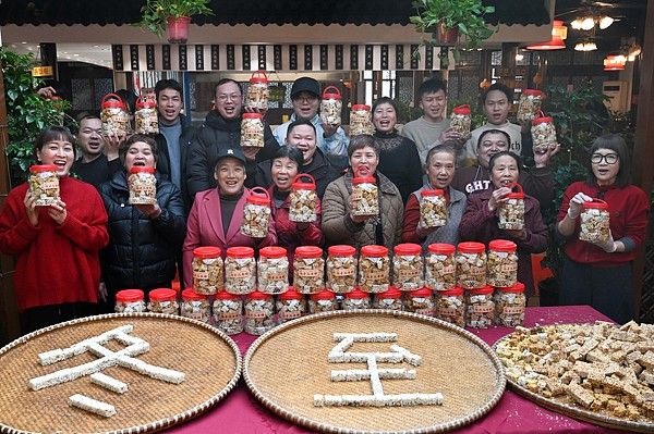 2025年12月20日,浙江金华,武义县南唐食府农家乐的游客和市民领取亲手制作的冬米糖。