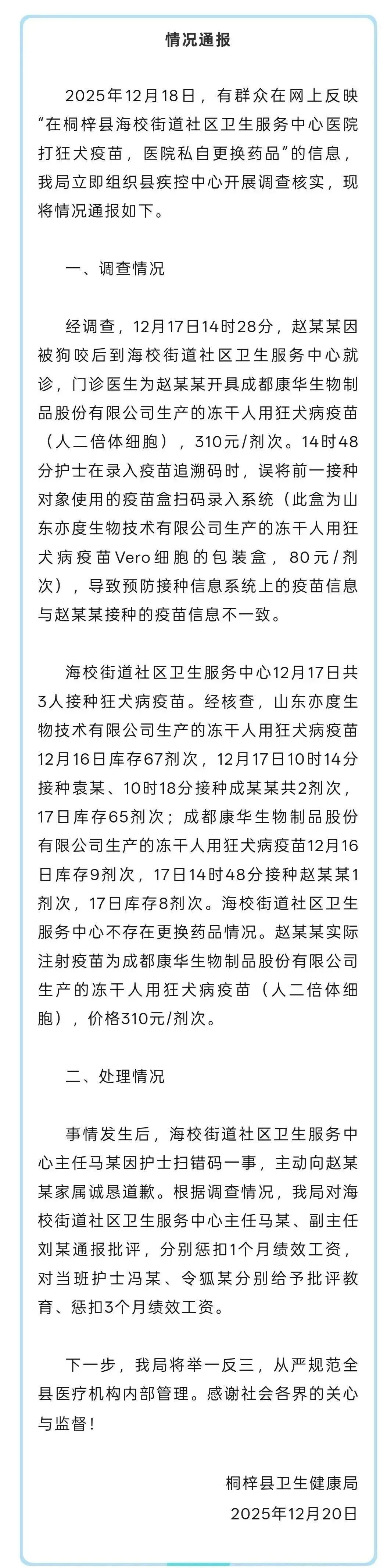 贵州桐梓县卫生健康局12月20日通报称,2025年12月18日,有群众在网上反映“在桐梓县海校街道社区卫生服务中心医院打狂犬疫苗,医院私自更换药品”的信息,我局立即组织县疾控中心开展调查核实,情况通报具体内容如下: