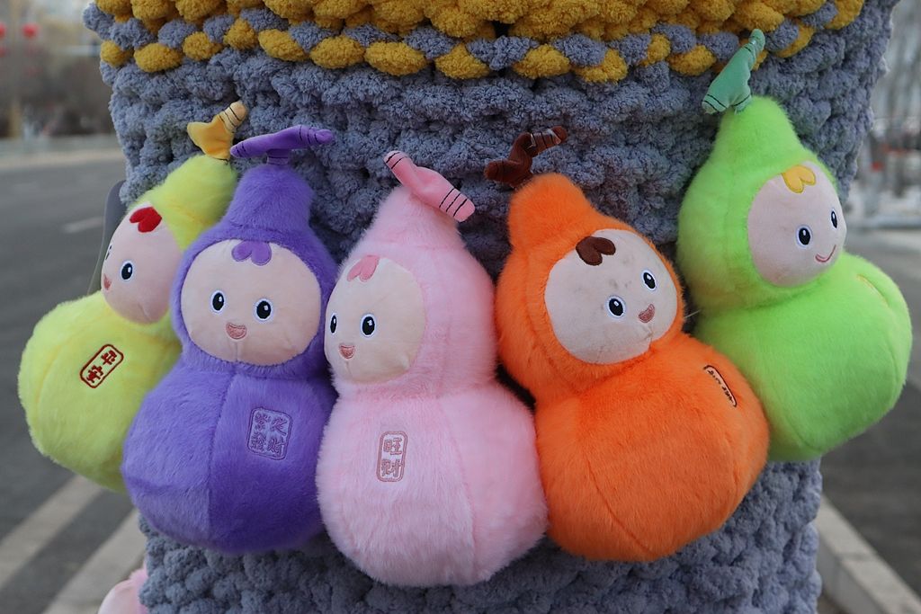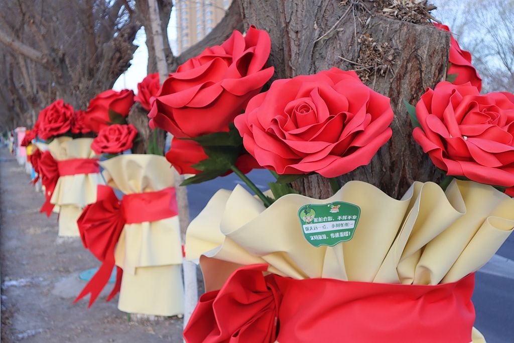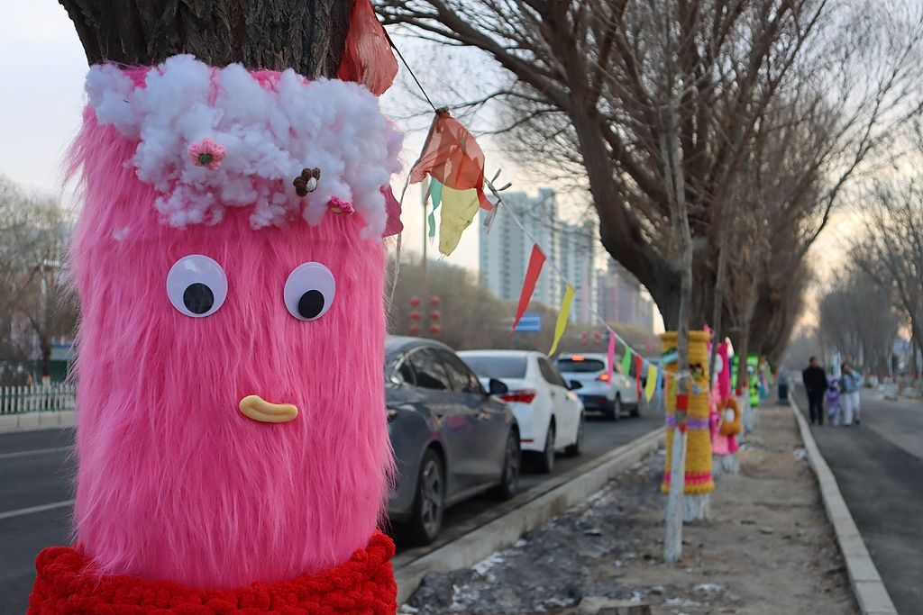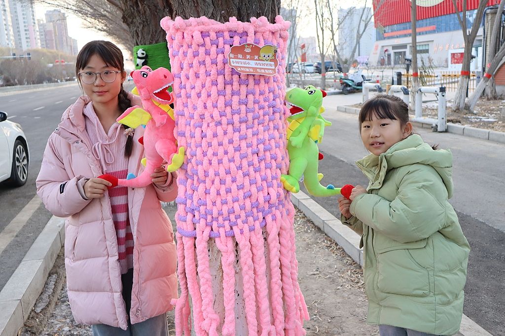 2025年12月20日,新疆哈密,人们为街边树木穿上彩色绒线编织的“新衣”。八一南路文化馆前,冬日树木被创意“唤醒”。人们为街边的树木穿上了用彩色绒线精心编织的“新衣”——玫瑰花、熊猫等卡通形象包裹着树干,让整条街道在寒冬中洋溢着温暖与浪漫的艺术气息。