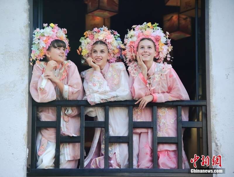浙江绍兴,几位来自德国的中学生入乡随俗、身着汉服畅游街头