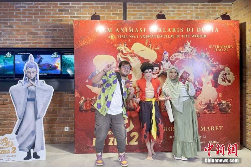 2025年3月15日,中国动画电影《哪吒之魔童闹海》在印度尼西亚雅加达举行首映式,电影海报前,当地民众扮演的“哪吒”炫酷吸睛。中新社记者 李志全 摄