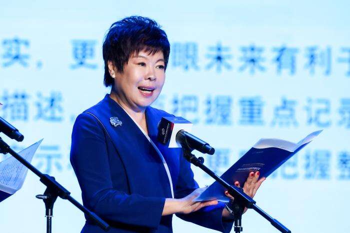 论坛现场,学者于丹谈《2025年中华文化国际传播研究报告》。中国外文局供图