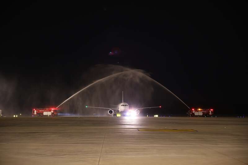 “轰——”当天19时许,首航航班老挝航空QV863落地滑行,接受民航最高礼仪“水门礼”,两侧水柱在空中交汇,场面庄重而壮观。