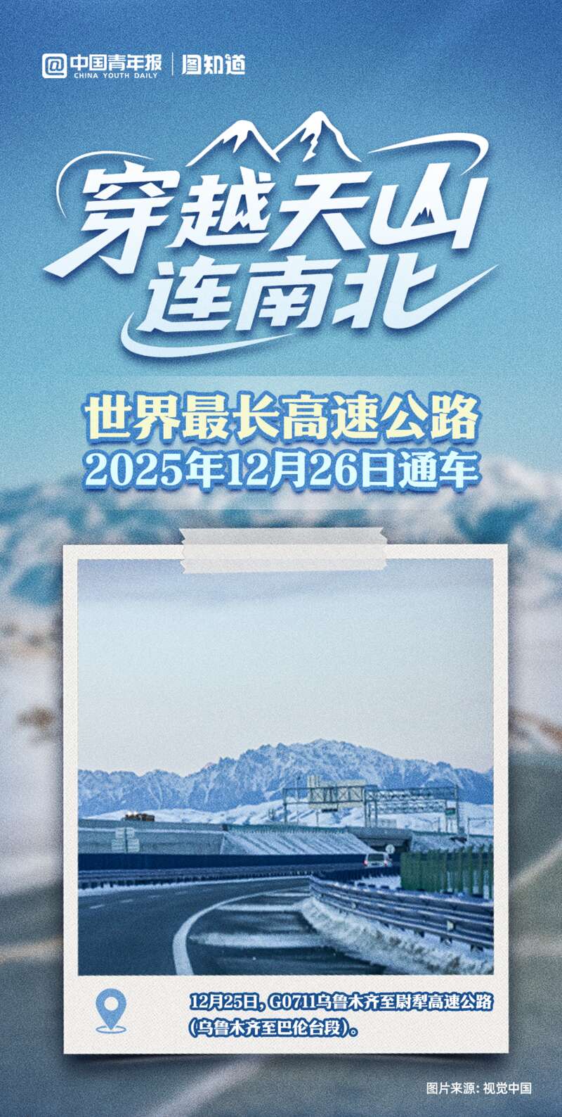 中国青年报客户端 | 2025-12-26 18:3012月26日,全长324.7公里的G0711乌鲁木齐至尉犁高速公路通车。其中天山胜利隧道创造了世界最长高速公路的隧道、高速公路竖井深度世界第一两项世界纪录。这条连通新疆南北的交通大通道,将极大便利当地人员往来和物流畅通。通车后,乌鲁木齐市至库尔勒市驾车时长由此前的7小时缩短至3.5小时。
