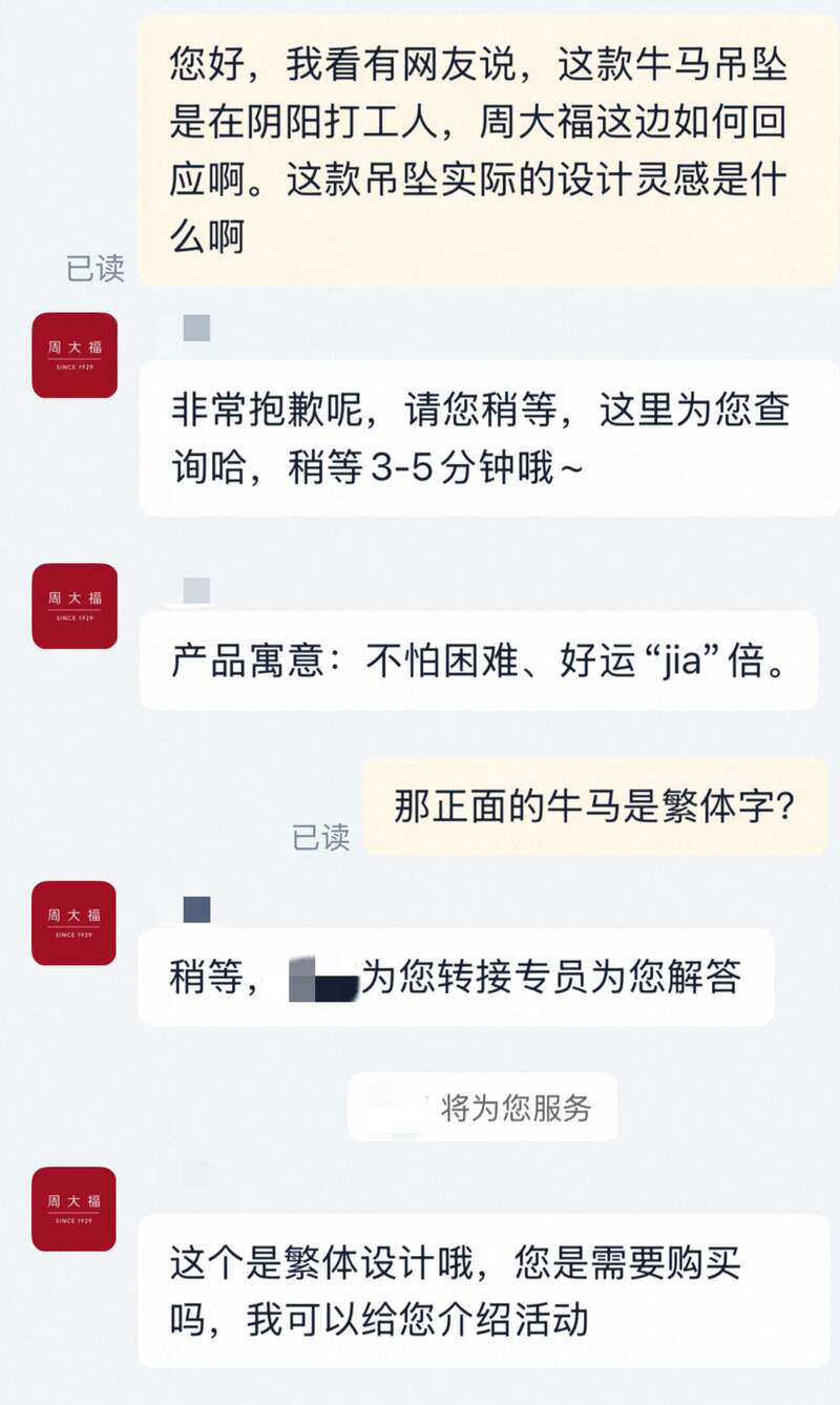 12月26日,记者就此事咨询了周大福某电商平台官方旗舰店的客服。客服回应称,该款产品的寓意为不怕困难、好运“jia”倍,正面的“牛马”为繁体设计。