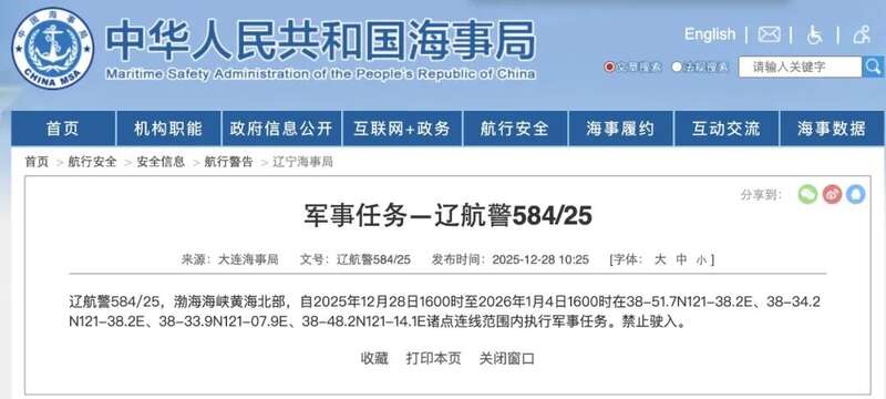 据中国海事局网站消息,大连海事局发布航行警告,自2025年12月28日16时至2026年1月4日16时,渤海海峡黄海北部部分水域范围内执行军事任务。禁止驶入。