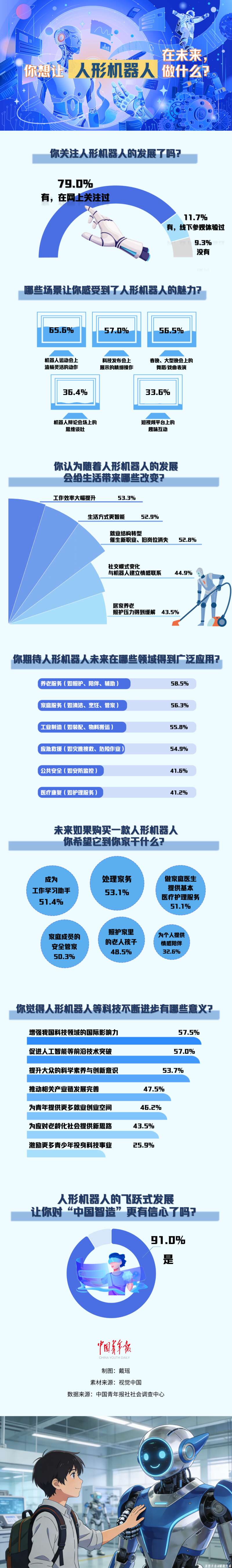 从事高空作业等高危工作、成为老人的左膀右臂、做一名专属智能管家……随着人形机器人迅速发展,大家也对其未来的应用场景有了更多想象。近日,中国青年报社社会调查中心联合问卷网(wenjuan.com)发布的一项有1502名受访者参与的调查显示,如果未来购买一款人形机器人,处理家务(53.1%)、成为工作学习助手(51.4%)、做家庭医生,提供基本医疗护理服务(51.1%)是受访者最希望人形机器人做的事。91.0%的受访者表示人形机器人的飞跃发展让自己对“中国智造”更有信心。