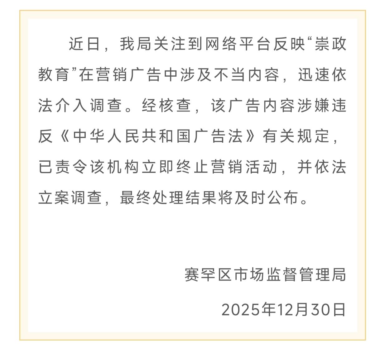 12月30日,内蒙古呼和浩特市赛罕区市场监督管理局发布情况通报称,经核查,该广告内容涉嫌违反《中华人民共和国广告法》有关规定,已责令涉事机构立即终止营销活动,并依法立案调查。