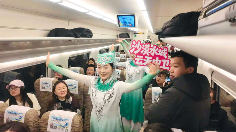 有“沙漠水城”之称的中卫市地处腾格里沙漠东南缘,黄河穿城而过,大漠、长河、绿洲在此共生,素有“天下黄河富宁夏,首富中卫”之美誉。当地立足沙漠资源禀赋,打造了星星酒店、黄河宿集、“青春漠漠搭”沙漠营地、沙漠冰雪馆等一批休闲度假产品。12月28日,D8953次列车从中卫南站驶发后,中卫市以图文展示的形式,向各地旅客推介中卫冬季文旅资源与特色产品;还为旅客们带来了快闪“青春高铁行”、宁夏花儿、舞蹈“盖碗喜迎天下客”“走咧走咧去宁夏”等文艺节目。