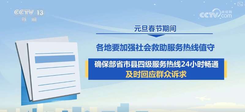 《通知》要求,元旦春节期间,各地要加强社会救助服务热线值守,确保部省市县四级服务热线24小时畅通,及时回应群众诉求。