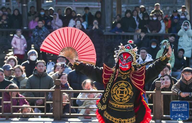 ↑ 1月1日,在京杭大运河畔的山东省枣庄市台儿庄古城,民间艺人在进行“变脸”表演。新华社发(孙中喆 摄)