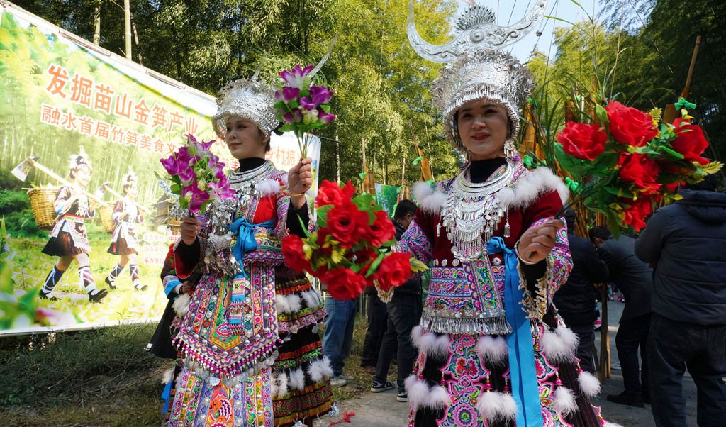 2026年1月7日,广西融水,香粉乡九都村楠竹种植基地,两名苗族姑娘在挖冬笋比赛中表演。