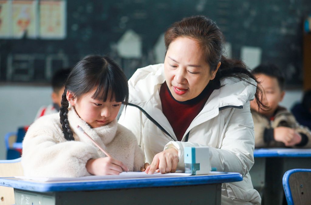 2026年1月8日,贵州黔西,五里布依族苗族乡茶林小学教学点,老师在课堂上辅导学生。