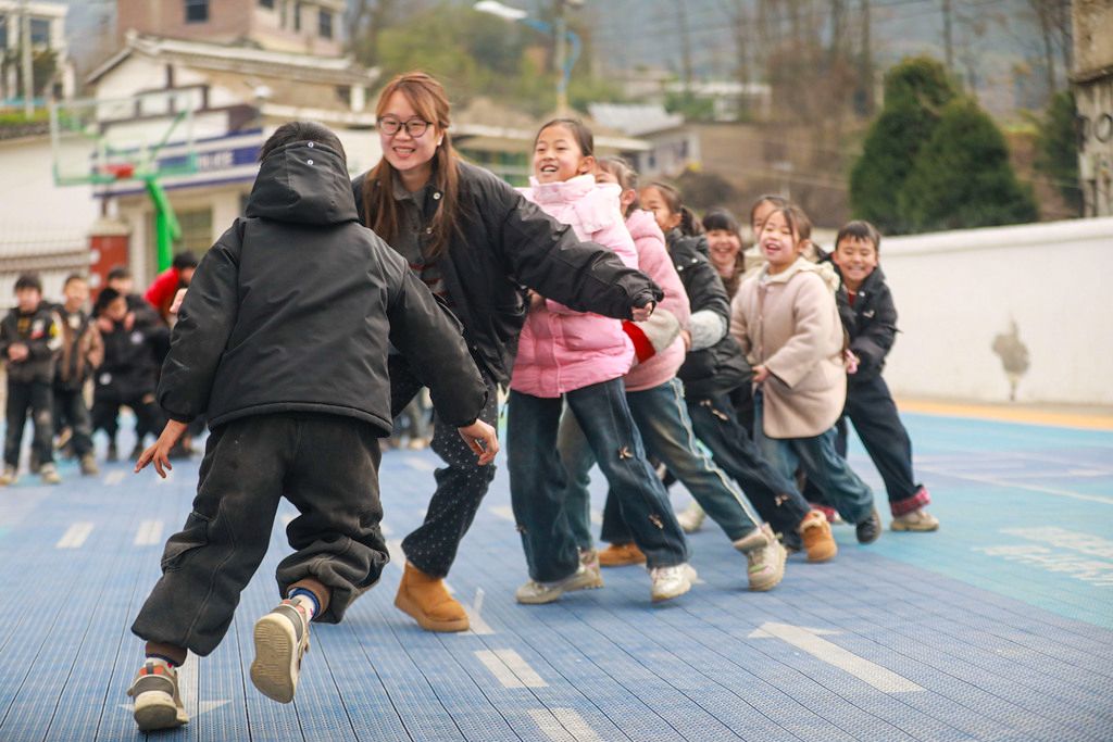 2026年1月8日,贵州黔西,五里布依族苗族乡茶林小学教学点,老师带领学生课间做老鹰捉小鸡游戏。