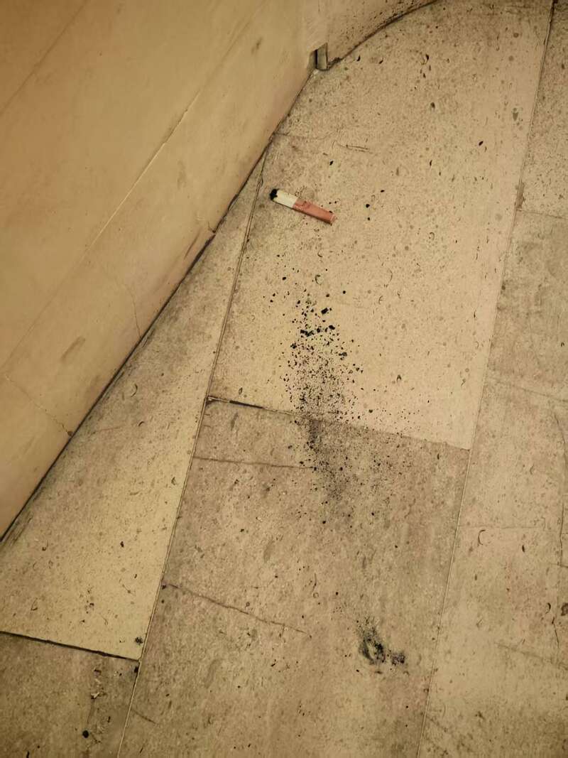 离三里屯不远的朝阳门,银河SOHO同样标明禁止吸烟,而且在楼宇外的中心广场设置了吸烟区。购物中心内,保洁员和扫地机器人保持着室内环境的整洁。但记者刚走到一处卫生间外的拐角处,就闻到飘来的烟味。走近一看,有人潇洒地深吸一口、扔掉烟头、踩上一脚,头也不回地带着烟雾扬长而去。留在瓷砖地面上的是半截烟头和记录它坠落轨迹的黑色烟灰。这些不和谐的画面,与整栋建筑内外的干净有序极其不协调。
