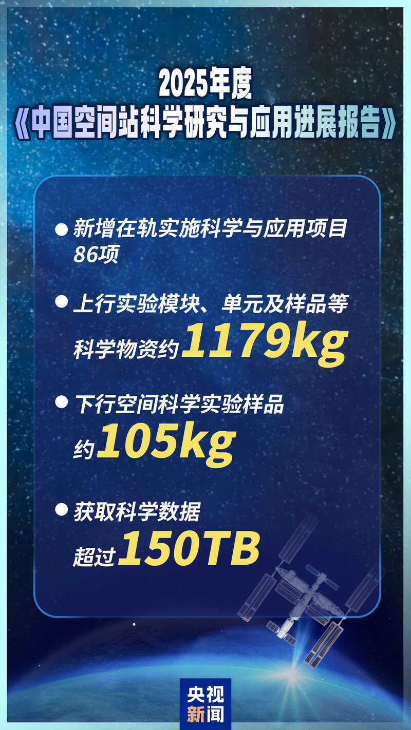 据中国载人航天工程办公室消息,北京时间2026年1月8日,中国载人航天工程办公室面向全社会发布了2025年度《中国空间站科学研究与应用进展报告》。
