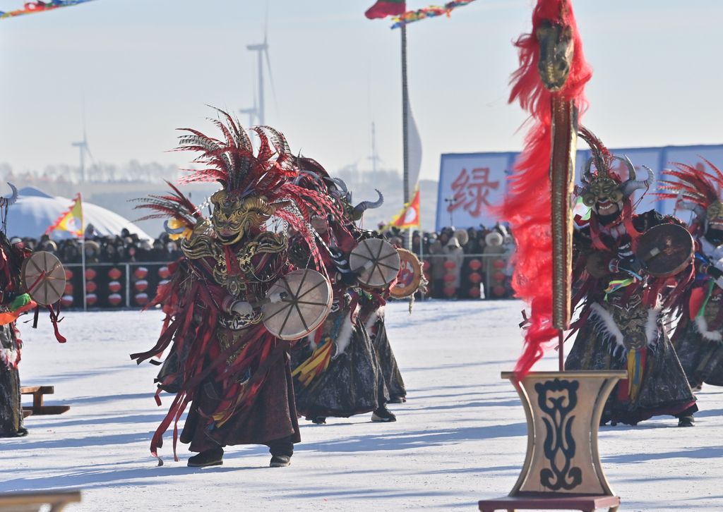 2026年1月8日,吉林松原查干湖第24届冰雪渔猎文化旅游节开幕,数万名中外游客齐聚冰湖,见证冬捕奇观。图为“祭湖醒网”仪式中的萨满舞表演。 中新社记者 张瑶 摄