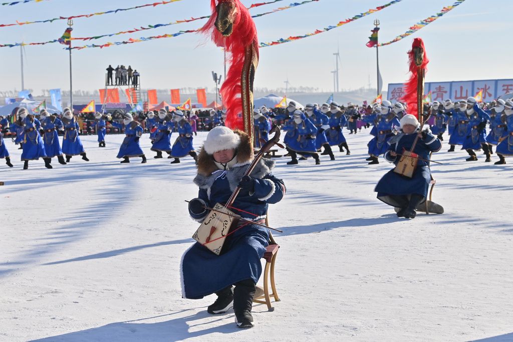 2026年1月8日,吉林松原查干湖第24届冰雪渔猎文化旅游节开幕,数万名中外游客齐聚冰湖,见证冬捕奇观。图为开幕式上的马头琴表演。 中新社记者 张瑶 摄