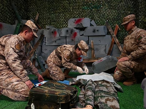 “战场空间有限,这个动作既护伤员又保自己!”紧急救治技能训练室内,白赟把模拟弹片、废墟场景搬进训练室,他趴在模拟战壕里示范“低姿搬运伤员”,手肘磨得发红仍不忘提醒受训学员动作要领。