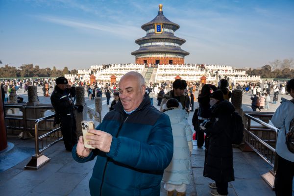 2026年1月9日,北京天坛公园内热闹非凡。随着中国免签“朋友圈”的不断扩大,越来越多的外国旅客慕名前来游览。不同地域不同文化背景的人们相聚在祈年殿下,相互吸引,共同谱写着文化交融的美好篇章。