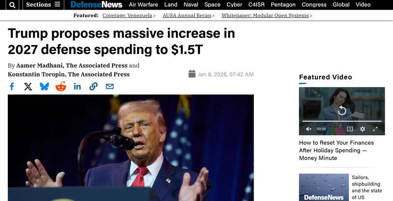 中国青年报客户端北京1月9日电 (中青报·中青网记者 张昊天)“美国军费再创新高”并非新闻,但美国总统特朗普对2027财年的展望还是堪称“令人震撼”。根据他的初步设想,2027年,美国军费将达到1.5万亿美元,较上个月获批的2026年度预算飙升50%。“这将使我们能够建立我们应有的‘梦想军队’。”他日前在“真实社交”平台上发帖说,“更重要的是,无论敌人是谁,此举都能确保我们的安全。”