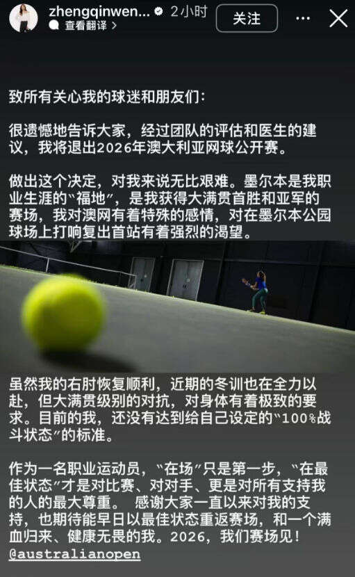 1月8日,中国球员郑钦文在个人社交账号宣布,退出2026年澳大利亚网球公开赛。