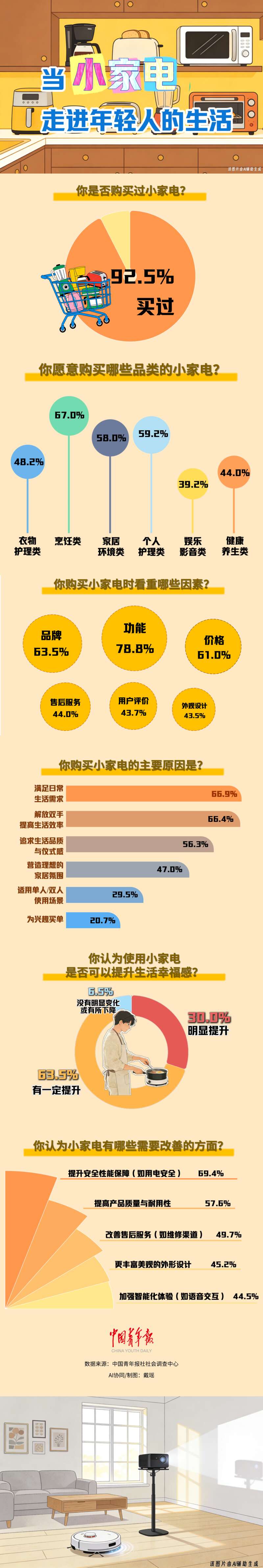 扫地机器人、多功能电锅、蓝牙音响……如今,各式各样的小家电在为年轻人带来便利的同时,也为他们按下了“幸福快捷键”。你是否购买过小家电?小家电为你的生活带来了怎样的改变?近日,中国青年报社社会调查中心联合问卷网(wenjuan.com)对1335名青年进行的一项调查显示,92.5%的受访青年购买过小家电,93.5%的受访青年认为使用小家电可以提升生活幸福感。年轻人为什么会选择购买小家电?满足日常生活需求(66.9%)、提高生活效率(66.4%)、追求生活品质与仪式感(56.3%)位列前三。
