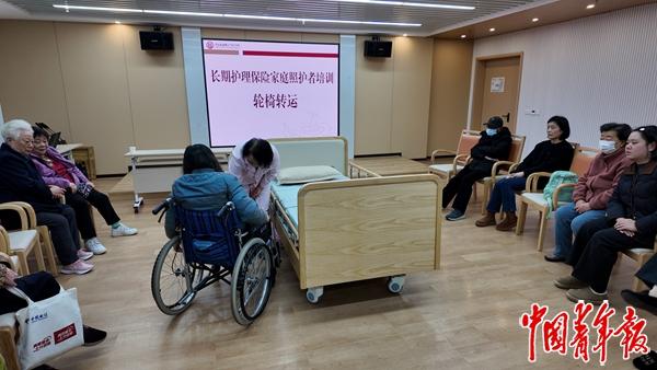 2025年12月22日,浙江省宁波市海曙区广安养怡院正在进行长期护理保险家庭照护者培训,当天的培训内容是轮椅转运。据了解,这样的培训每周都有,免费面向社区居民开放,感兴趣者都可以报名参加。中青报·中青网记者 刘昶荣/摄