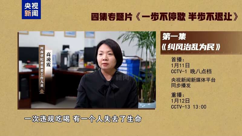电视专题片《一步不停歇 半步不退让》第一集《纠风治乱为民》,讲述纪检监察机关不断加大风腐同查同治力度,锲而不舍落实中央八项规定精神,严肃查处违规吃喝背后的团团伙伙、请托办事和利益输送,集中整治群众身边不正之风和腐败问题,让群众真切感到正风反腐加力度、清风正气在身边。总台央视综合频道1月11日晚8点档播出,央视新闻新媒体平台同步播发。