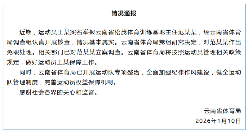 同时,云南省体育局已开展运动队专项整治,全面加强纪律作风建设,健全运动队管理制度,完善运动员权益保障机制。