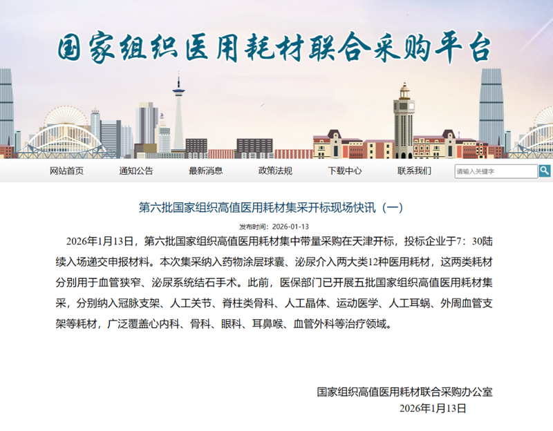2026年1月13日,第六批国家组织高值医用耗材集中带量采购在天津开标,投标企业于7:30陆续入场递交申报材料。本次集采纳入药物涂层球囊、泌尿介入两大类12种医用耗材,这两类耗材分别用于血管狭窄、泌尿系统结石手术。此前,医保部门已开展五批国家组织高值医用耗材集采,分别纳入冠脉支架、人工关节、脊柱类骨科、人工晶体、运动医学、人工耳蜗、外周血管支架等耗材,广泛覆盖心内科、骨科、眼科、耳鼻喉、血管外科等治疗领域。