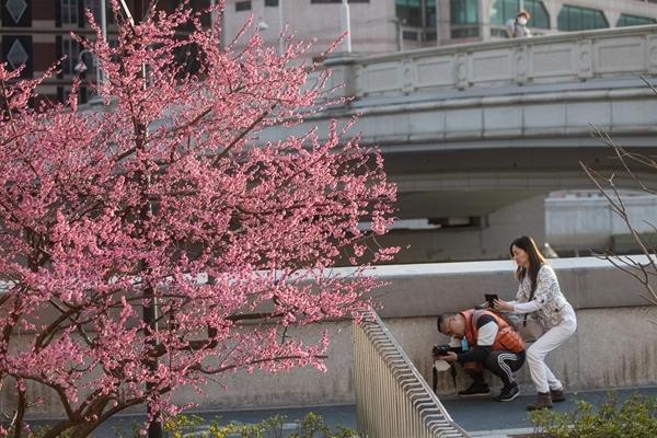 华东政法大学长宁校区散落着20余栋凝结中西文明精华的历史建筑,苏州河在此有一个近180度的大转弯,刚领完结婚证的张女士和夏先生正在以学校的历史建筑为背景拍照留念。张女士说,他们都是律师,家离这里地铁一站路的距离,平时也爱来走走逛逛。“来之前特意在社交媒体上找攻略,选了几个好看的机位,希望能纪念这特别的一天。”