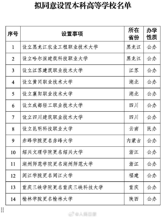 据人民日报,记者近日从教育部获悉,根据有关规定,经教育部党组会议审议,拟同意设置黑龙江农业工程职业技术大学等14所学校。教育部自2026年1月12日至1月16日对名单进行公示。