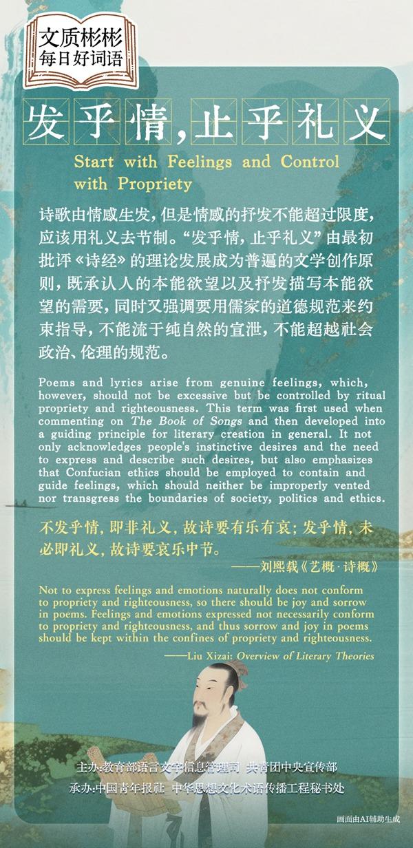Poems and lyrics arise from genuine feelings, which, however, should not be excessive but be controlled by ritual propriety and righteousness. This term was first used when commenting on The Book of Songs and then developed into a guiding principle for literary creation in general. It not only acknowledges people's instinctive desires and the need to express and describe such desires, but also emphasizes that Confucian ethics should be employed to contain and guide feelings, which should neither be improperly vented nor transgress the boundaries of society, politics and ethics.