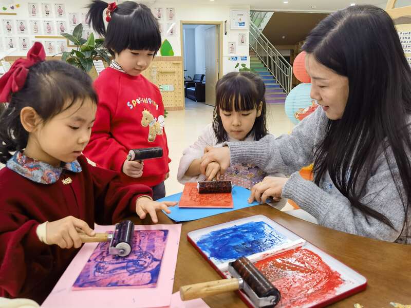 1月13日,青岛市崂山金融区实验幼儿园,老师正手把手教小朋友制作非遗拓印画。李庚伟/摄