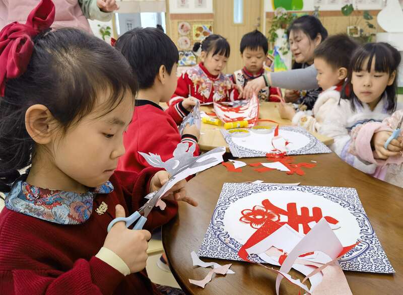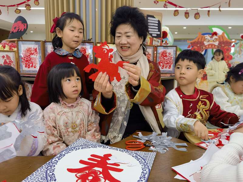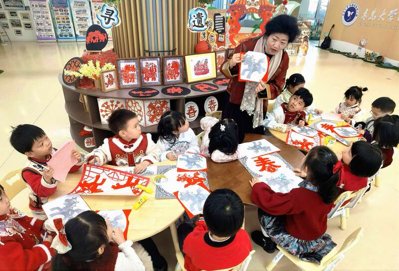 1月13日,青岛市崂山金融区实验幼儿园,非遗剪纸传承人苏霞正在为小朋友们讲解剪纸的制作方法。当日,非遗代表性传承人和志愿者在这里手把手教小朋友们制作具有新春年味和马年元素的非遗产品。近年来,青岛市崂山区以社团为载体,将剪纸、拓印画、竹编、崂山武术、扎染蓝印花布等丰富多彩的非遗项目带入校园,全年开展活动百余场,为校园文化生活注入鲜活的文化韵味,也让国家级、省市级非物质文化遗产在青少年心中播下了传承的种子。李庚伟/摄